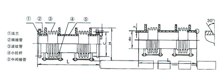 橫向小拉桿波紋補償器由兩段波紋管、中間接管及帶有限螺母的小拉桿等零件組成,它在吸收管系任意平面內(nèi)的橫向位移,同時吸收軸向位移。小拉桿不能承受內(nèi)壓推力。