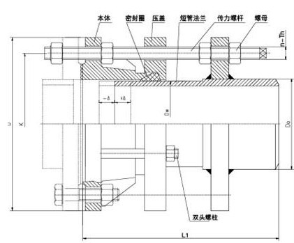 松套傳力接頭是在法蘭松套補(bǔ)償接頭的基礎(chǔ)上增設(shè)法蘭短管及傳力螺桿而成,次類型的補(bǔ)償接頭與松套補(bǔ)償接頭和松套限位補(bǔ)償接頭不同的是它的補(bǔ)償量是指在安裝及拆卸過程中的調(diào)節(jié)量,一旦將所有的螺母擰緊,它是剛性連接的,可以傳遞軸心力,從而保護(hù)閥門、泵等設(shè)備。